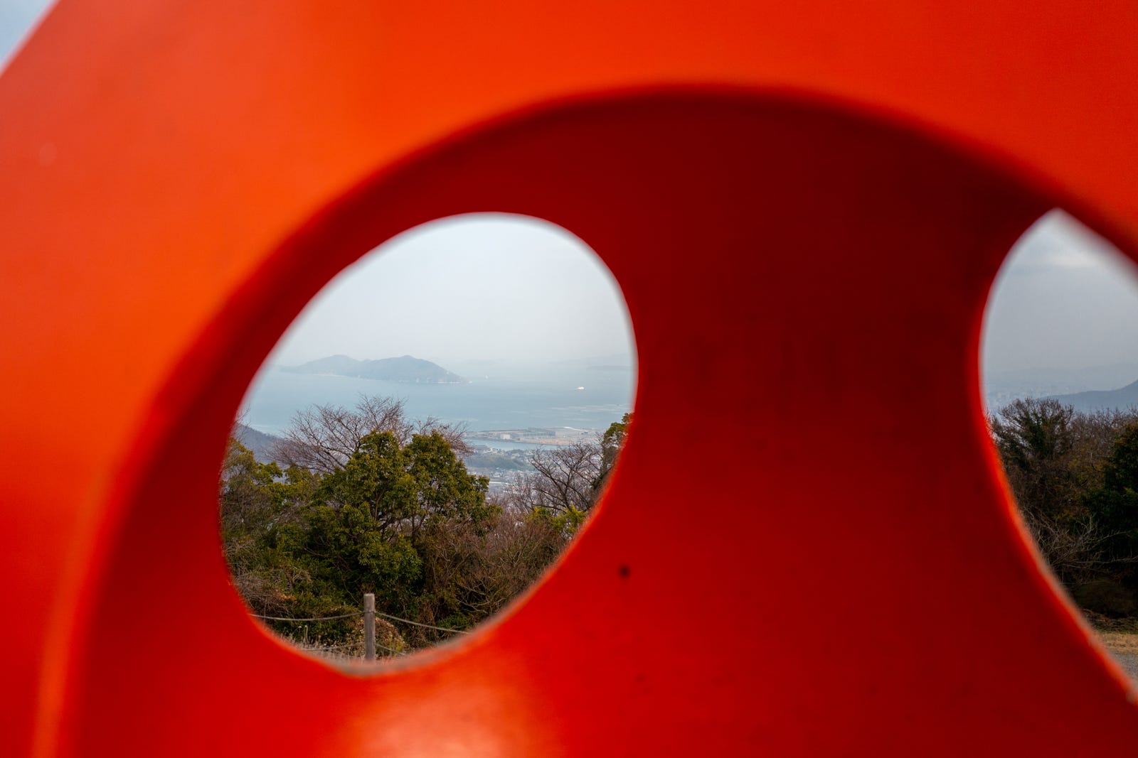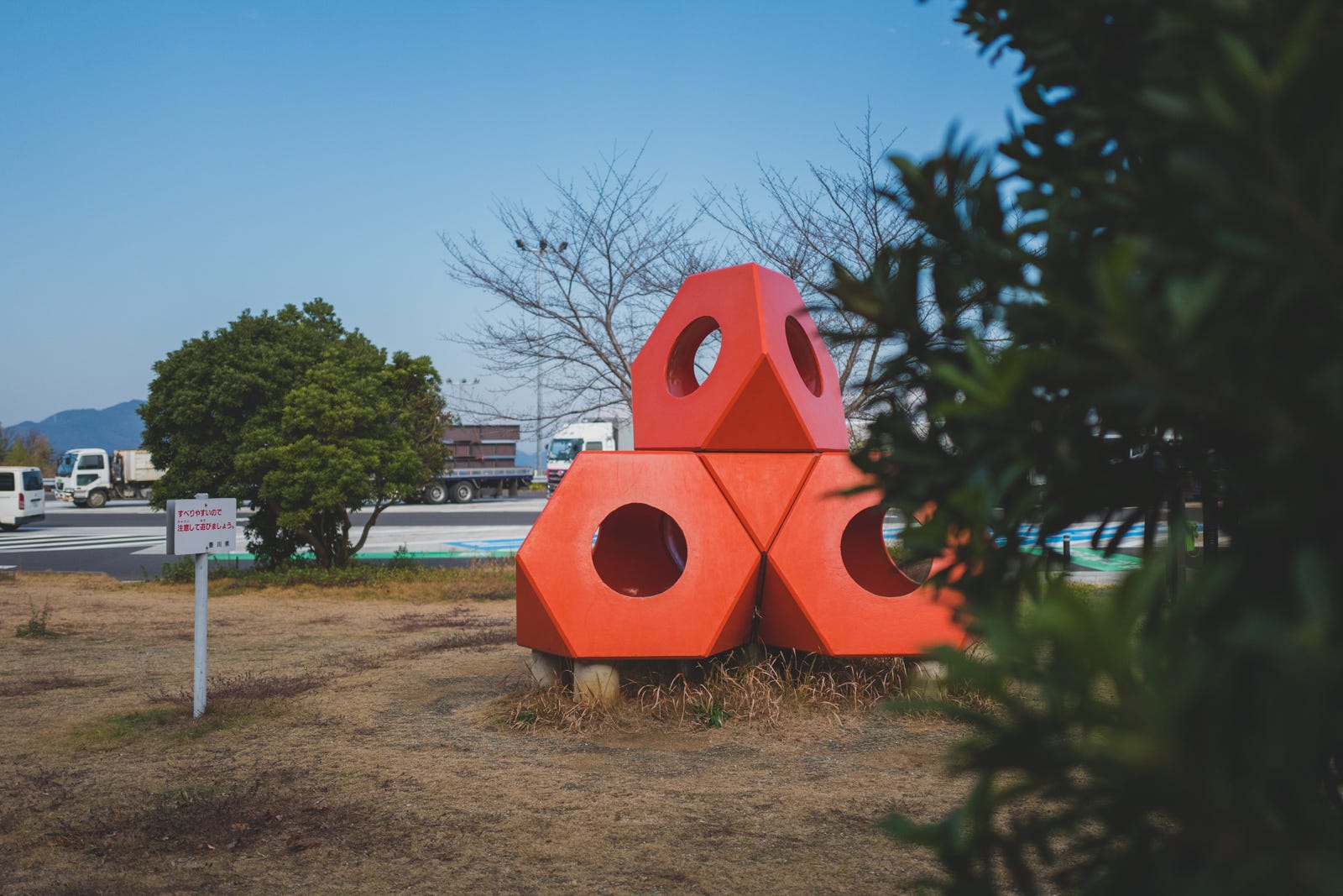 Stopping at the unassuming Tsuda-no-matsubara highway service area on the outskirts of Takamatsu. I’d heard there was a Noguchi sculpture on the westbound side, and sure enough there it was. A bright red Octetra Play Sculpture in a small park beside the parking area. What a strange place for a sculpture I thought? Somewhat neglected and completely overlooked by the visitors busily on their way to somewhere else. With an appointment at the Garden Museum to make, I too had no time to linger. After taking a few photographs of this more —Buckminster inspired?— design than sculpture, I was on my way.